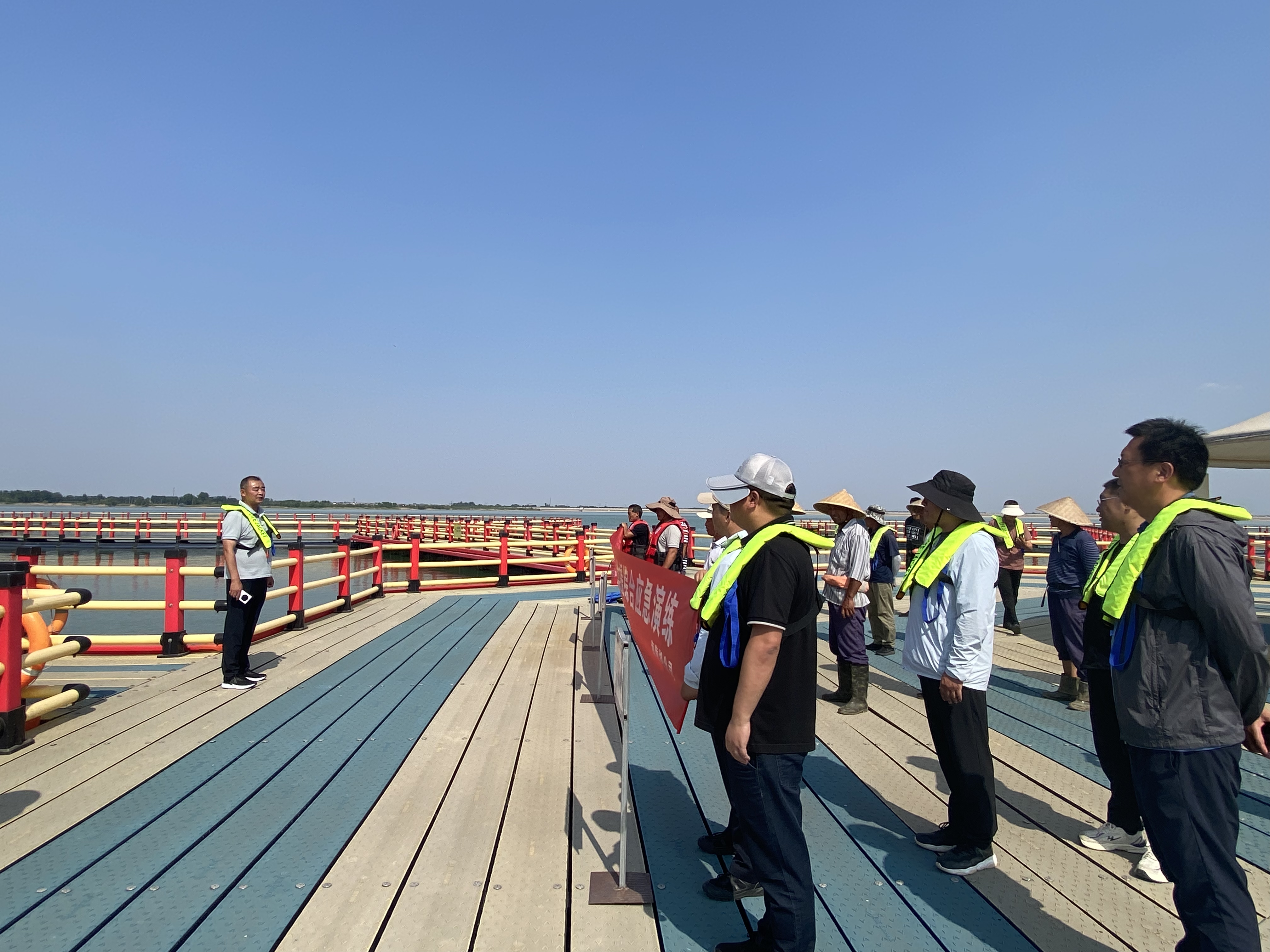 为切实保障作业人员生命安全,全面提升公司应对台风等自然灾害的应急处置能力,确保水面作业船舶及人员在遭遇险情时能够迅速有效得到救援,6月17日下午,海陵湖公司以全国第24个安全生产月为契机,开展2025年度水上救援综合应急演练。海陵湖公司和养殖合作团队全体员工参加演练,特邀连云港市石梁河水库管理处安监科贾玉山、东海县农业农村局安监科王毅现场观摩指导。