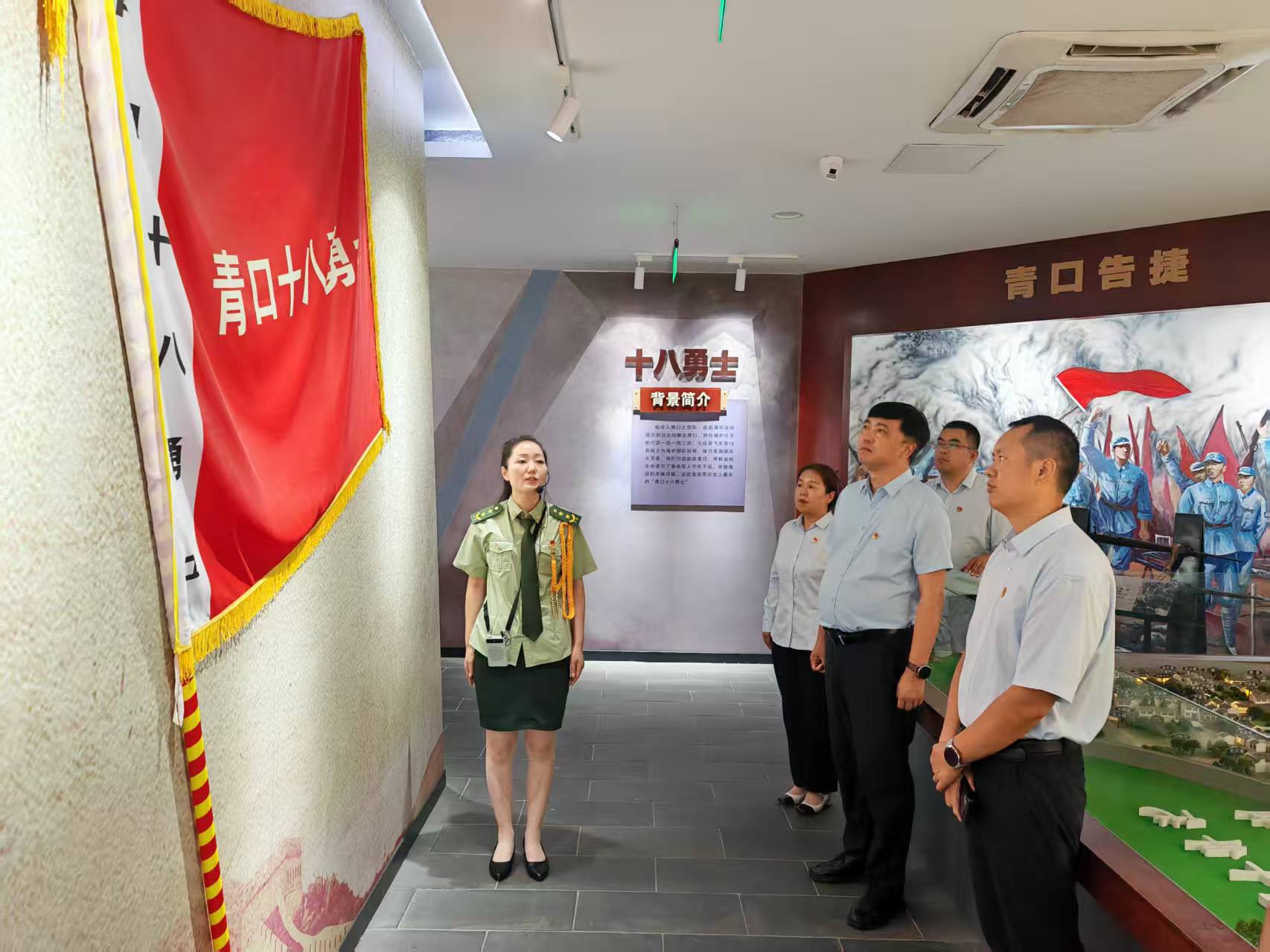 随后,党员干部步入展厅,在讲解员引导下认真参观学习。馆内珍藏的历史图片、文献史料、沙盘模型及抗战枪支,生动再现了当年青口战役的壮烈场景与十八勇士的铁血壮举。大家驻足凝视,深刻感悟那段硝烟弥漫的历史,体会革命先辈视死如归的英雄气概和为人民无私奉献的崇高精神。